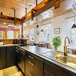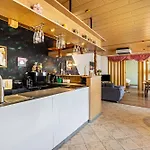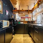 La cuisine complète, fournie dans l'établissement, comprend une bouilloire électrique, un four et de la vaisselle.